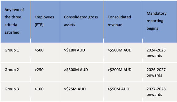 The Australian Government phased approach to these reporting requirements has not changed, but the proposed start date for Group 1 will be pushed out by at least six months, from 1 July 2024 to 1 January 2025 at the earliest.